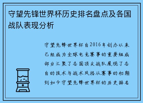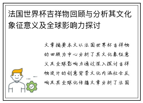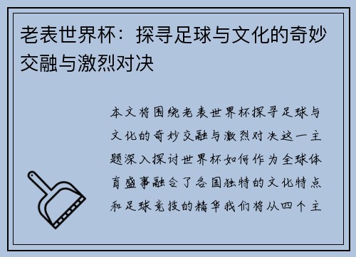文章摘要:本文通过分析神杯之争和世界杯荣耀赛场,探索了世界足球巅峰对决如何展现传奇球队的风采。作为全球最受瞩目的体育赛事,世界杯不仅仅是对球员技术和团队协作的检验,更是世界足球历史和文化的重要象征。文章从四个方面深入探讨了世界杯比赛中的传奇球队风采,分别包括:一、世界杯中的经典对决及传奇球队的表现;二、足球技战术的演变与球队风采的关系;三、球队精神与领袖作用在世界杯赛场中的重要性;四、数据分析对传...